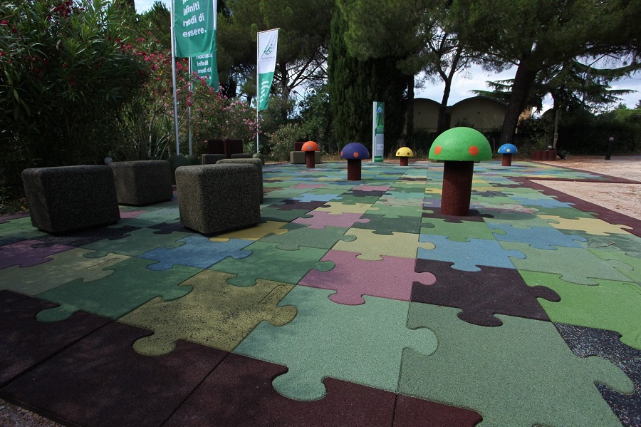 Grazie ad Ecopneus, la società consortile senza scopo di lucro principale operatore della raccolta e del recupero dei Pneumatici Fuori Uso in Italia, è stata realizzata negli anni a Festambiente una vera e propria città della gomma riciclata con tante soluzioni innovative per il divertimento di grandi e piccini: campi da calcio e da basket, l’area minigolf, il parco giochi inclusivo TuttinGioco, la riqualificazione acustica dell’Auditorium, piste ciclabili, arredi urbani e aree relax, tutti realizzati con la gomma riciclata da PFU.