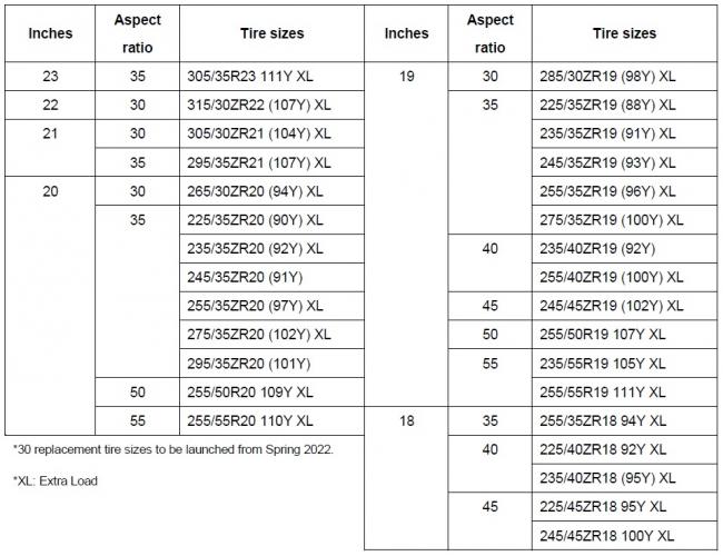 L’azienda prevede di introdurre 30 dimensioni di pneumatici nel segmento aftermarket, che vanno da 225/40ZR18 92Y XL a 305/35R23 111Y XL partire appunto dalla primavera del 2022, aumentando successivamente la gamma di dimensioni, comprese quelle dedicate al primo equipaggiamento, fino a 43 misure, per poi arrivare gradualmente a 80 entro la fine del 2022.