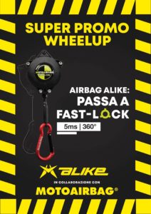Con lo scopo di migliorare ulteriormente le performance degli airbag Alike, Wheelup ha rinforzato la partnership con Motoairbag, dando la possibilità ai propri clienti di aggiornare gli airbag A-bag Gilet e Zaino al nuovissimo sistema di attivazione Fast-Lock ad un prezzo convenzionato di 99,00 euro e spedizione di rientro omaggio.