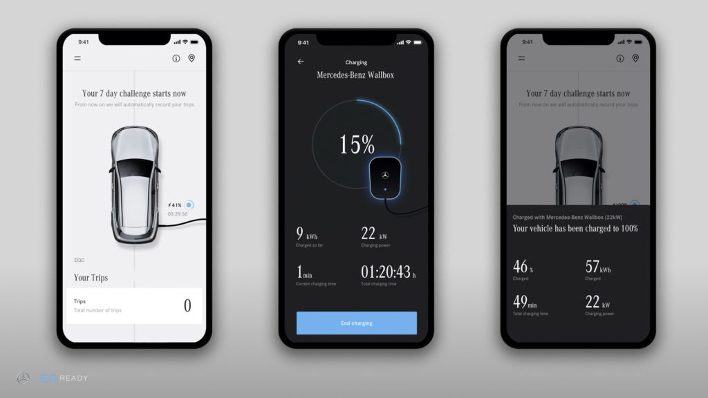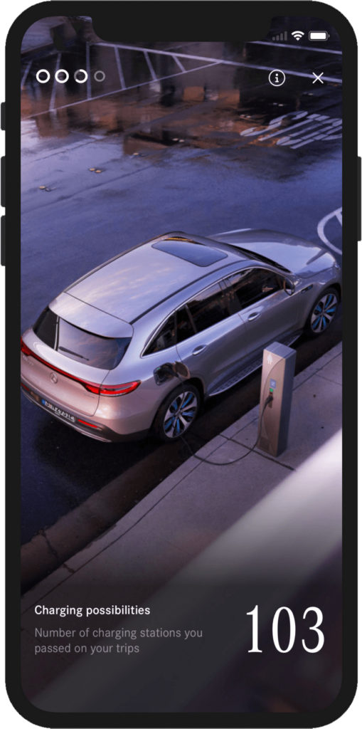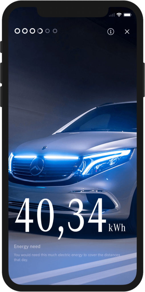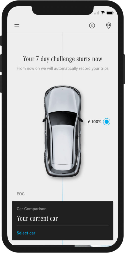 Dopo aver avviato l’app inizia la “sfida di 7 giorni” nella quale si analizzano i tragitti quotidiani dell’utente, con il suo consenso. In questo caso si applica il principio dell’autodeterminazione: i dati personalizzati vengono raccolti soltanto previo consenso esplicito da parte dell’utente. Al termine dei 7 giorni l’app, sulla base delle abitudini di mobilità individuali, mostra se l’utente è pronto per un modello ibrido plug-in o un’auto elettrica di Mercedes-Benz. Durante la sfida vengono visualizzate all’utente ogni giorno informazioni aggiornate sui suoi tragitti e sulla mobilità elettrica di Mercedes-Benz.