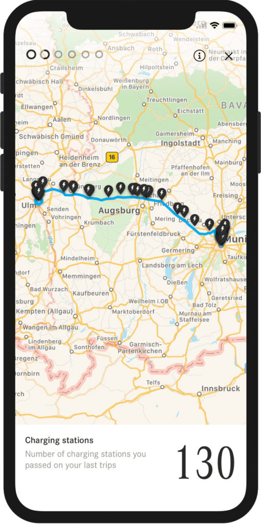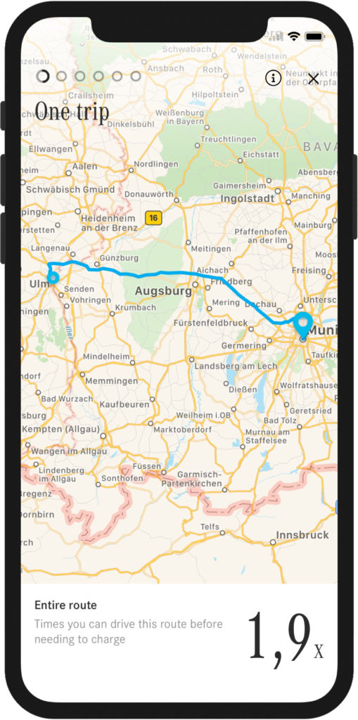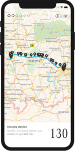 L’app verifica se le destinazioni dell’utente possono essere raggiunte anche con la trazione elettrica, ma non solo: lo informa ogni giorno sul fabbisogno elettrico e sulle infrastrutture di ricarica disponibili lungo i suoi tragitti. Inoltre l’utente ha la possibilità di simulare i tempi di ricarica per le diverse soluzioni di ricarica.