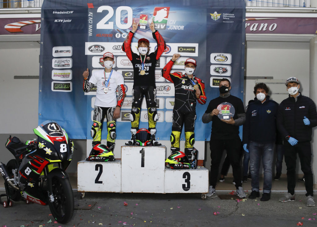 Il diciassettenne veneto ha chiuso la stagione a quota 186 punti, precedendo Samuel Treccani (129) e Yari Favero (121). I vincitori sono stati festeggiati e premiati da Lorenzo Savadori, fresco Campione Italiano SBK su Aprilia RSV4 e tester MotoGP per Aprilia Racing.