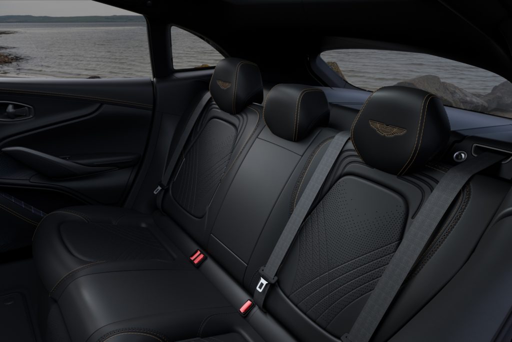Le opzionali pinze dei freni in colore nero conferiscono una certa finezza alle ruote ad effetto affumicato, e l’eleganza complessiva dell’esterno è evidenziata sia dai badge Aston Martin con scritta che da quelli alari e dai badge Q by Aston Martin sui parafanghi.
