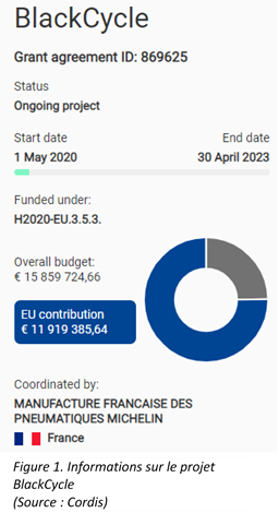 BlackCycle è un importante progetto europeo, che coinvolgerà 7 partner industriali, 5 organizzazioni di ricerca e tecnologia (RTO) e un cluster di innovazione in un consorzio europeo in 5 Paesi, per utilizzare i PFU nella produzione di pneumatici nuovi. Il coordinamento è stato affidato a Michelin e la UE ha approvato i finanziamenti lo scorso maggio.