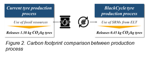 Di conseguenza, la catena del valore BlackCycle ha un’impronta di carbonio inferiore (vedi Figura 2), che emette 0,93 kg / CO2 / kg di pneumatici in meno e garantisce un minore utilizzo di risorse fossili, utilizzando 0,89 kg fossili / kg di PFU in meno.