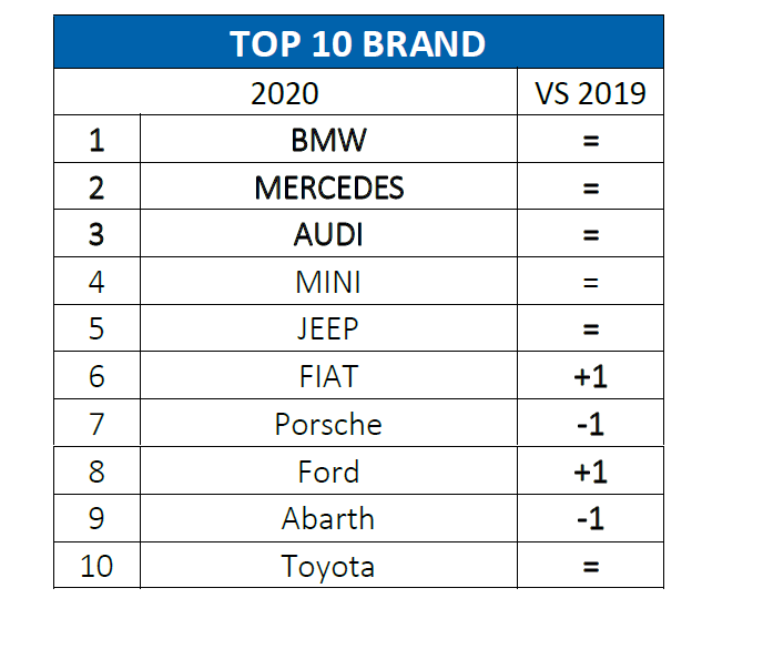 Seguono stabilmente Mini e Jeep, al quarto e quinto posto, mentre risalgono FIAT e Ford, rispettivamente al sesto e ottavo posto, a discapito di Porsche (7°) e della sfiziosa sportiva Abarth (9°). Chiude nuovamente la top ten la giapponese Toyota.