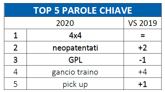 Osservando le parole più cercate nella categoria auto su Subito Motori, senza considerare brand o modelli specifici, gli italiani continuano a cercare vetture a trazione integrale 4×4, per esigenza di guidare su qualsiasi tipo di strada, per affidabilità o per passione. Al secondo posto, recupera due gradini rispetto al 2019 “neopatentati” grazie ai tanti che hanno cercato la loro prima auto partendo dai modelli adatti a norma di legge.