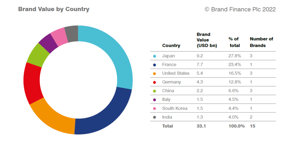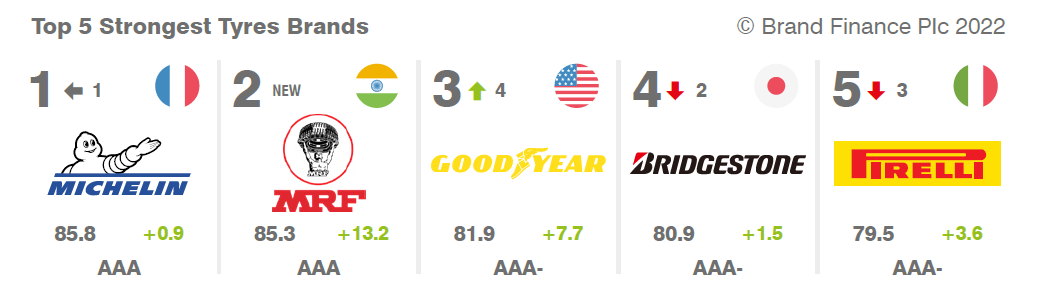 Michelin ha mantenuto il titolo di marchio di pneumatici con il più elevato valore al mondo, con una cifra stimata di 7,7 miliardi di dollari (in crescita del 13%) e un punteggio dell’indice di forza del marchio di 85,8 su 100.