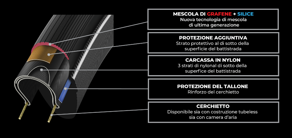 Resistenza e durevolezza sono essenziali per uno pneumatico il cui scopo è quello di portarti oltre nuovi limiti. Corsa N.EXT è il primo copertoncino della gamma Corsa realizzato con Nylon di alta qualità. Per aumentare la resistenza alle forature, la sezione centrale della carcassa utilizza 3 strati di nylon più un ulteriore strato protettivo posizionato tra carcassa e battistrada. Anche il tallone è avvolto in uno strato protettivo in nylon per aumentarne la resistenza. Il tallone è stato realizzato per facilitare il montaggio e il gonfiaggio dello pneumatico sia in versione tubeless che con camera d’aria.