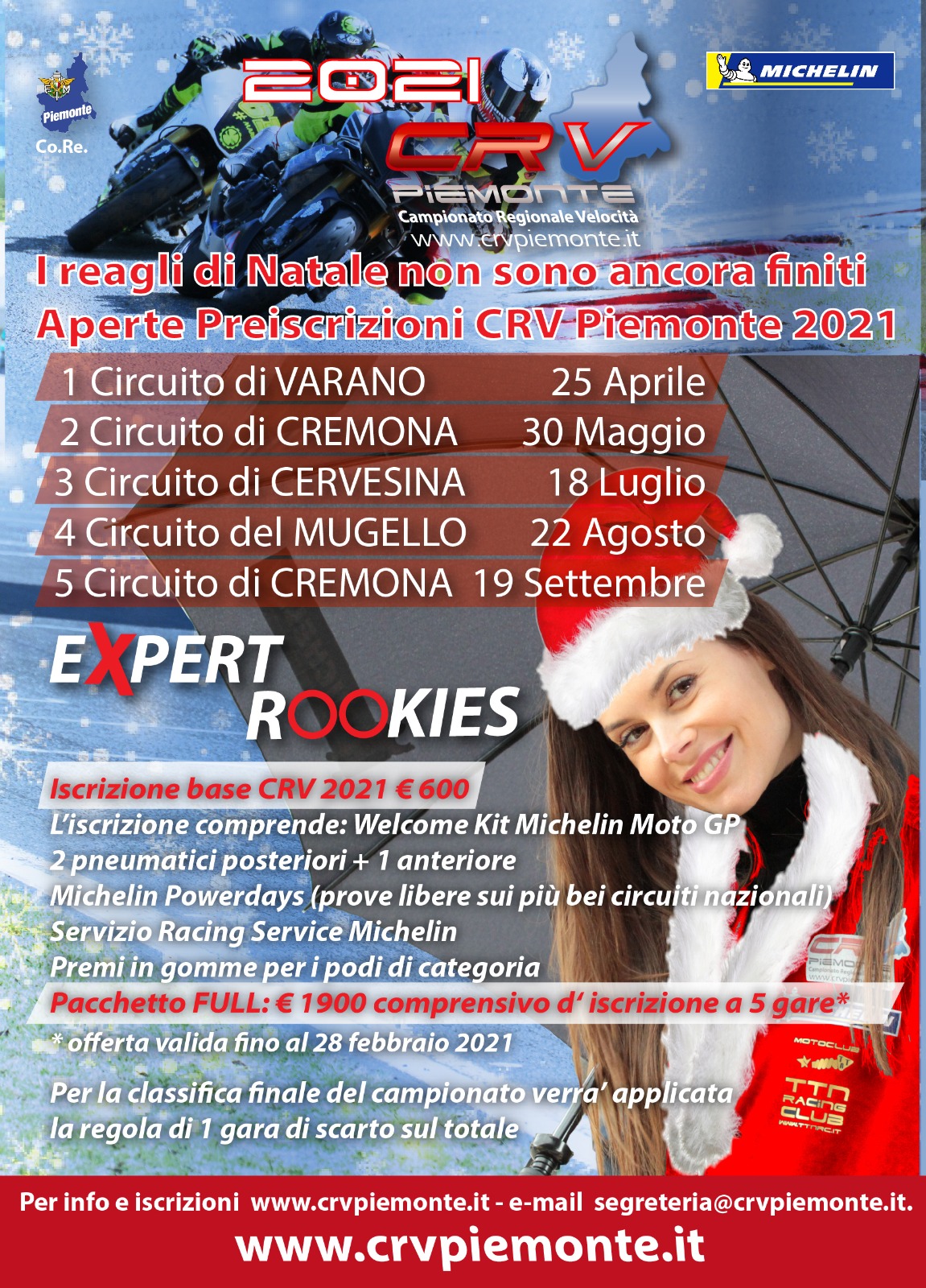Il CRV 2021, Campionato Regionale Velocità, giunto alla sua settima edizione, inizierà il 25 aprile a Varano, per proseguire poi il 30 maggio a Cremona, il 18 luglio a Cervesina, il 22 agosto al Mugello per chiudere il 19 settembre ancora a Cremona: come sempre, Michelin è partner del campionato.
