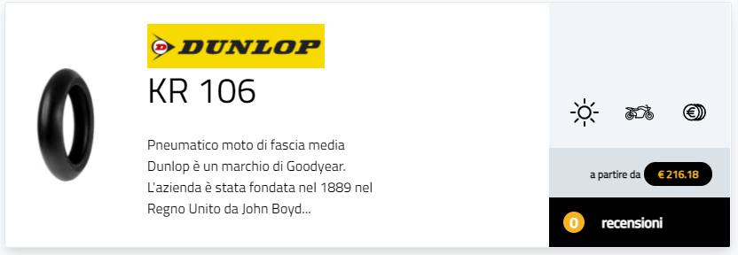 La combinazione Dunlop KR106/KR108 fa parte della gamma di prodotti Dunlop da pista che comprende le gomme slick KR e D212 (disponibile anche nella versione intagliata) e i pneumatici intagliati D213 GP Pro: sono stati sviluppati grazie all’esperienza di Dunlop in campionati Motorsport e hanno ottenuto vittorie in gare stradali come il TT dell’Isola di Man nelle categorie Superbike, Supersport e Superstock.