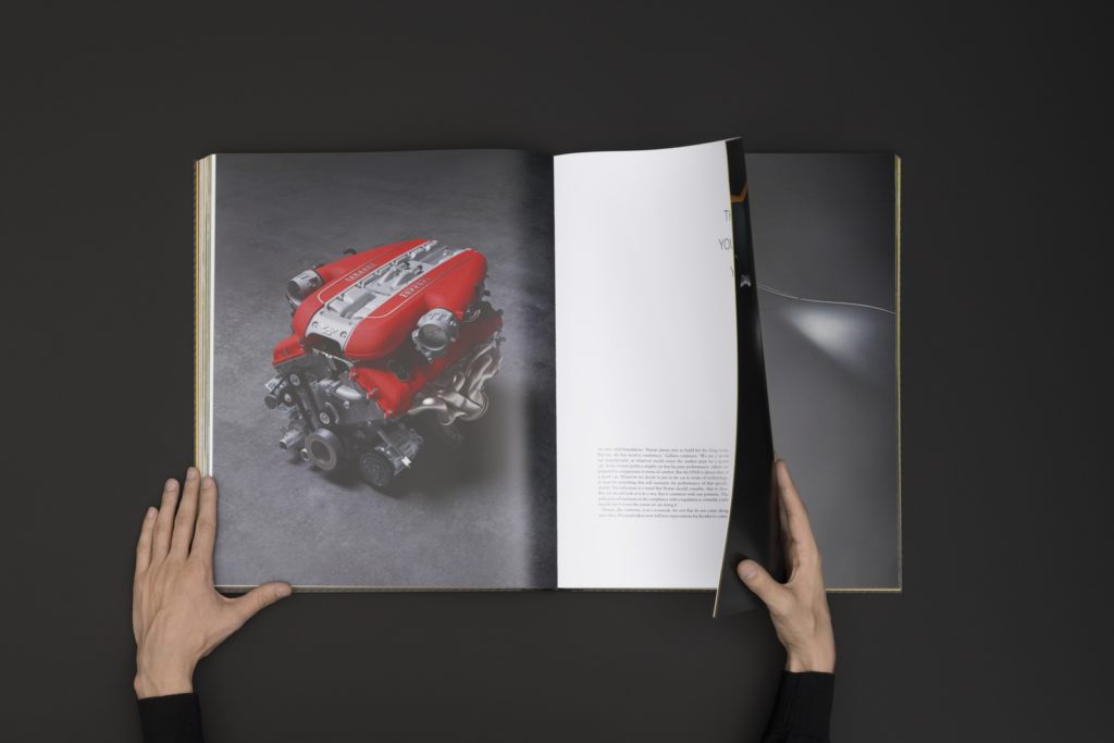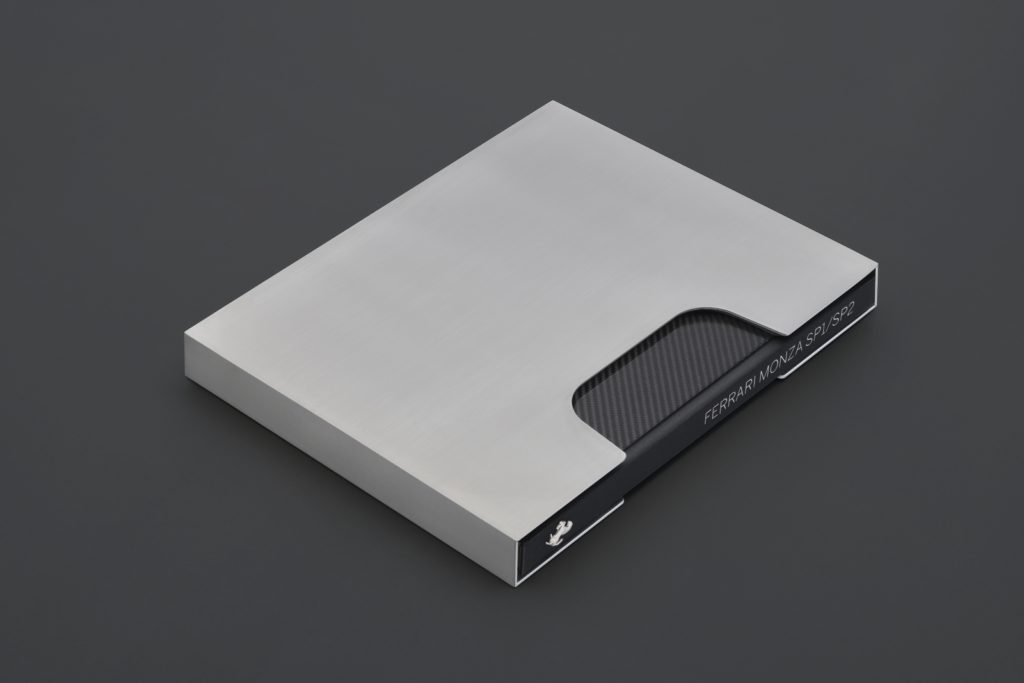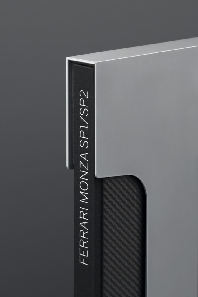 Il libro “Ferrari Monza SP1/SP2” è un volume unico: come la Monza è una scultura in movimento, così il libro si presenta come un’opera d’arte. Realizzato in un inedito grande formato e utilizzando una carta eco-friendly italiana di altissima qualità, il libro è ricco di dettagli che fanno riferimento all’auto stessa: la rilegatura in fibra di carbonio, la costa realizzata con la stessa pelle utilizzata per gli interni della Monza e la bellissima custodia esterna, completamente rivestita in Alcantara.