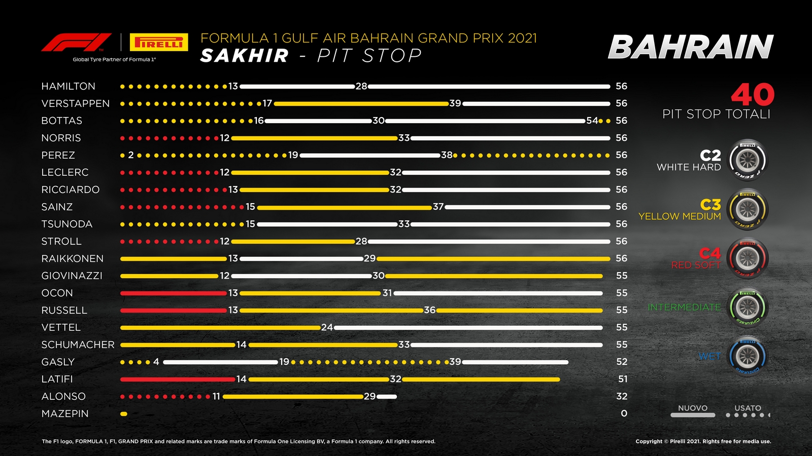 - HARD C2: Questa mescola è stata uno degli ingredienti chiave per il successo in Bahrain, utilizzata da Hamilton e Verstappen per lo stint finale decisivo. Mercedes e AlphaTauri sono stati gli unici Team a tenere due set di P Zero White Hard per la gara, con Hamilton che ha completato con questi pneumatici uno stint finale da 28 giri mantenendo ottime prestazioni fino al traguardo.