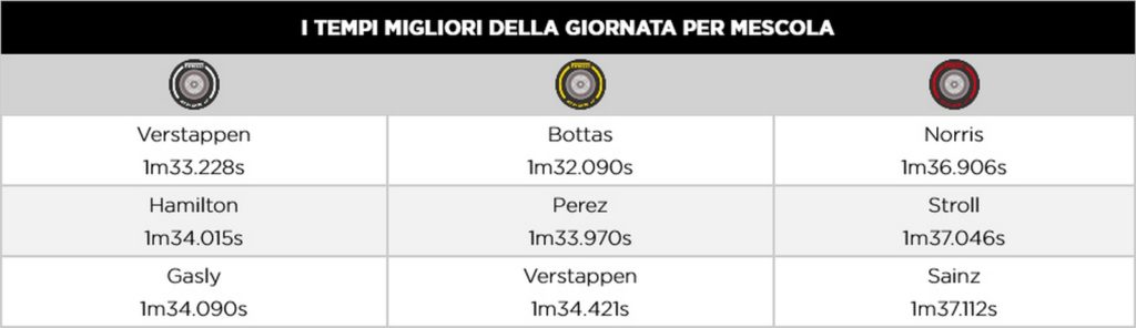 Valtteri Bottas (Mercedes) è arrivato 3° dopo aver effettuato un terzo pit stop sul finale per montare pneumatici P Zero Yellow medium e ottenere il punto in più in campionato per il giro veloce di gara. Anche Sergio Perez si è fermato tre volte al suo debutto in Red Bull, chiudendo la gara al quinto posto dopo essere partito dalla pitlane. Pierre Gasly (AlphaTauri) è stato l’unico altro pilota ad effettuare tra soste dopo un primo un pit-stop obbligato per un contatto.