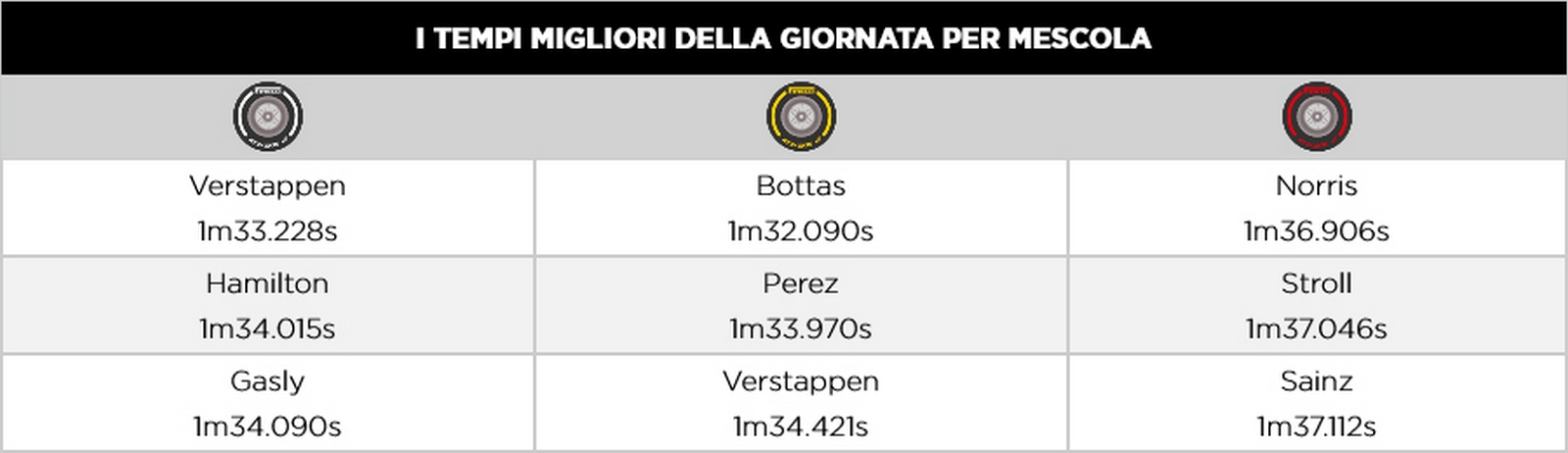 - MEDIUM C3: Pneumatici utilizzati dalla maggior parte dei piloti al via, compresi i primi tre in griglia. Verstappen li ha scelti anche per lo stint centrale, mentre Mercedes ha optato per la hard. Questa mescola ha dimostrato un gap prestazionale minimo rispetto alla hard in linea con i dati raccolti durante le prove libere.