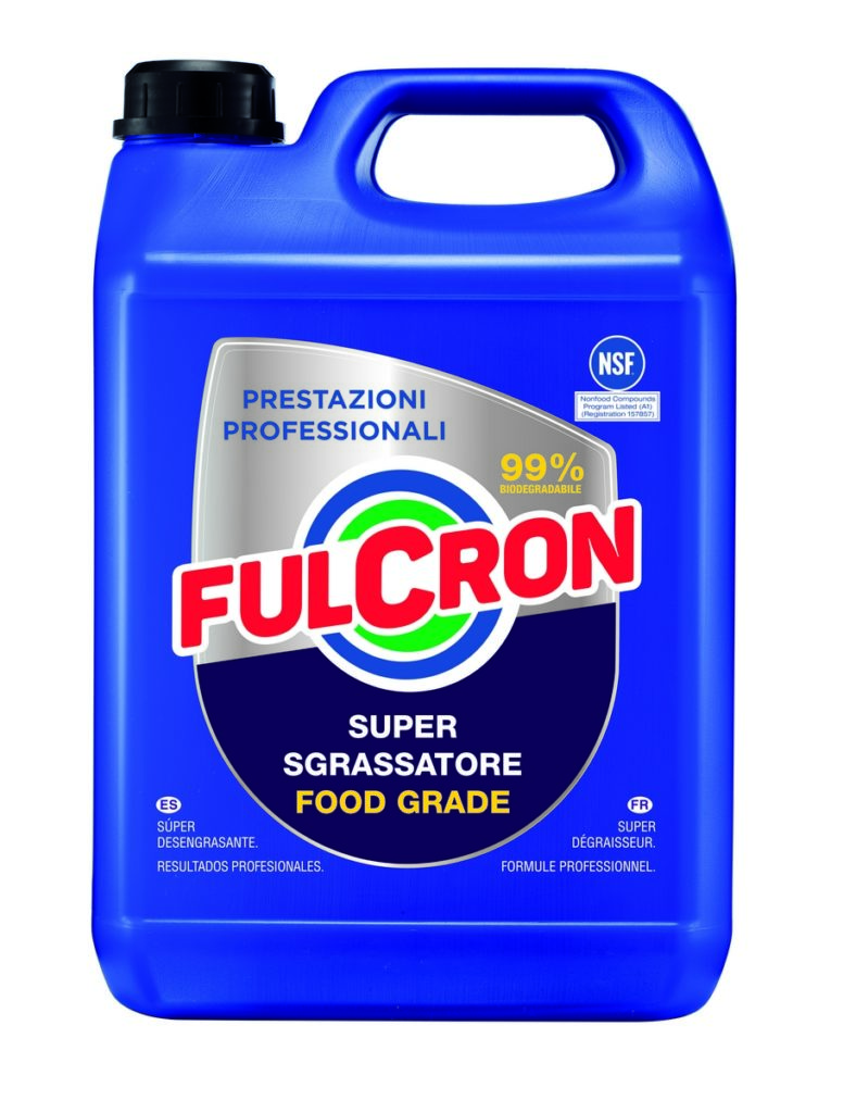 - Fulcron Super Sgrassatore Food Grade: Dedicato al mondo alimentare, dall’industria alla ristorazione, grazie alla sua formula concentrata senza aggiunta di solventi. Studiato per la rimozione di sporco e grasso di ogni tipo da un’ampia gamma di superfici, seguendo le indicazioni di diluizione garantisce elevata efficacia di pulizia, facilità di asportazione e risciacquo, limitando al massimo le contaminazioni residue sulle superfici. Una formula imbattibile anche nel tempo d’impiego che, se utilizzato in contesti professionali, porta con sé un significativo aumento della produttività. Registrato NSF A1. Disponibile nel formato Tanica 5L.