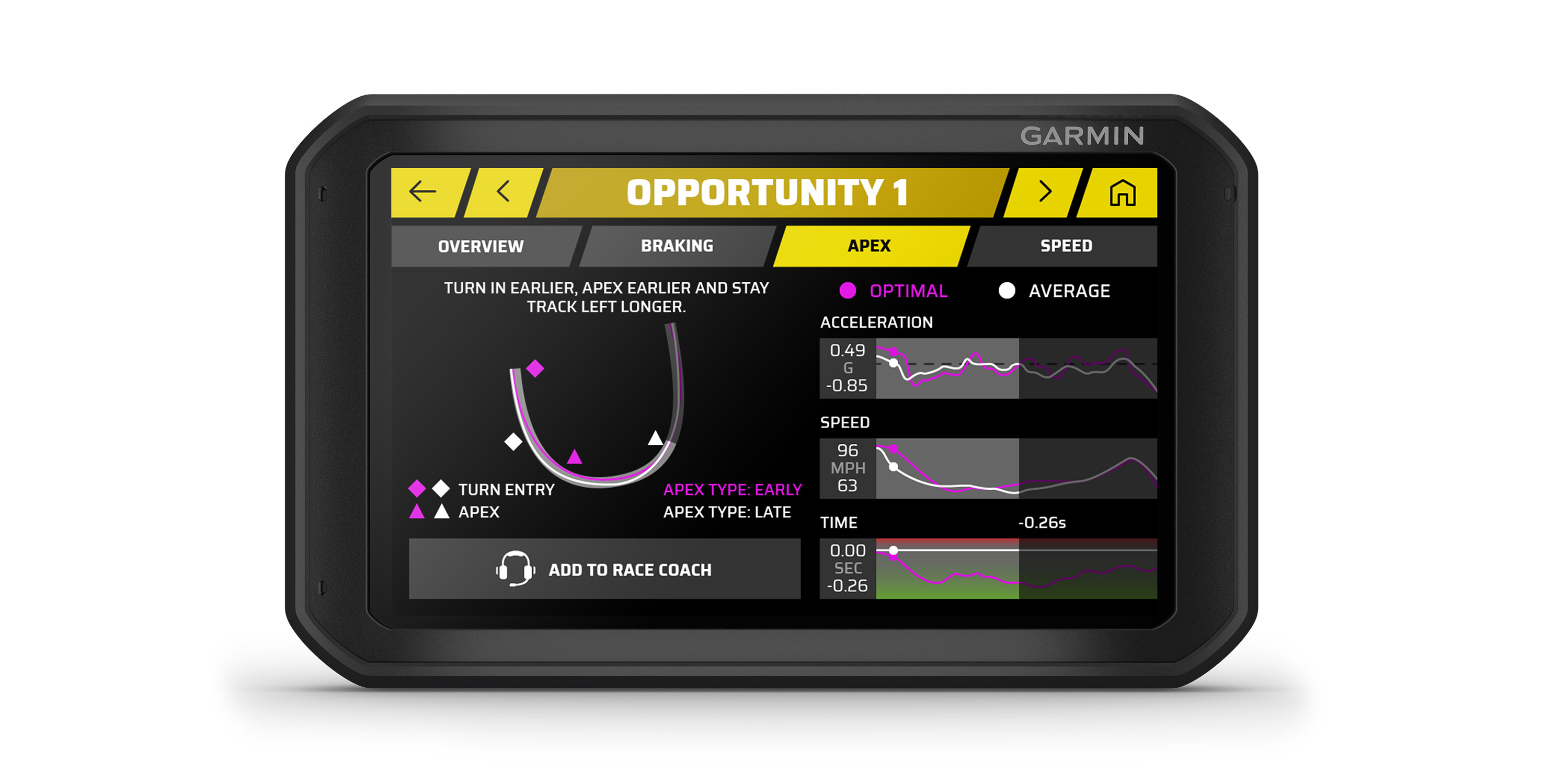 Grazie al GPS e ai suoi sensori inerziali è in grado di registrare staccata, frenata, inserimento, punto di corda, uscita e accelerazione: gli elementi fondamentali di ogni curva. Strumento essenziale per monitorare le proprie performance Garmin Catalyst è una soluzione unica in grado di aiutare i piloti a comprendere a fondo i propri punti deboli e offrire gli strumenti essenziali per raggiungere e superare i propri limiti.