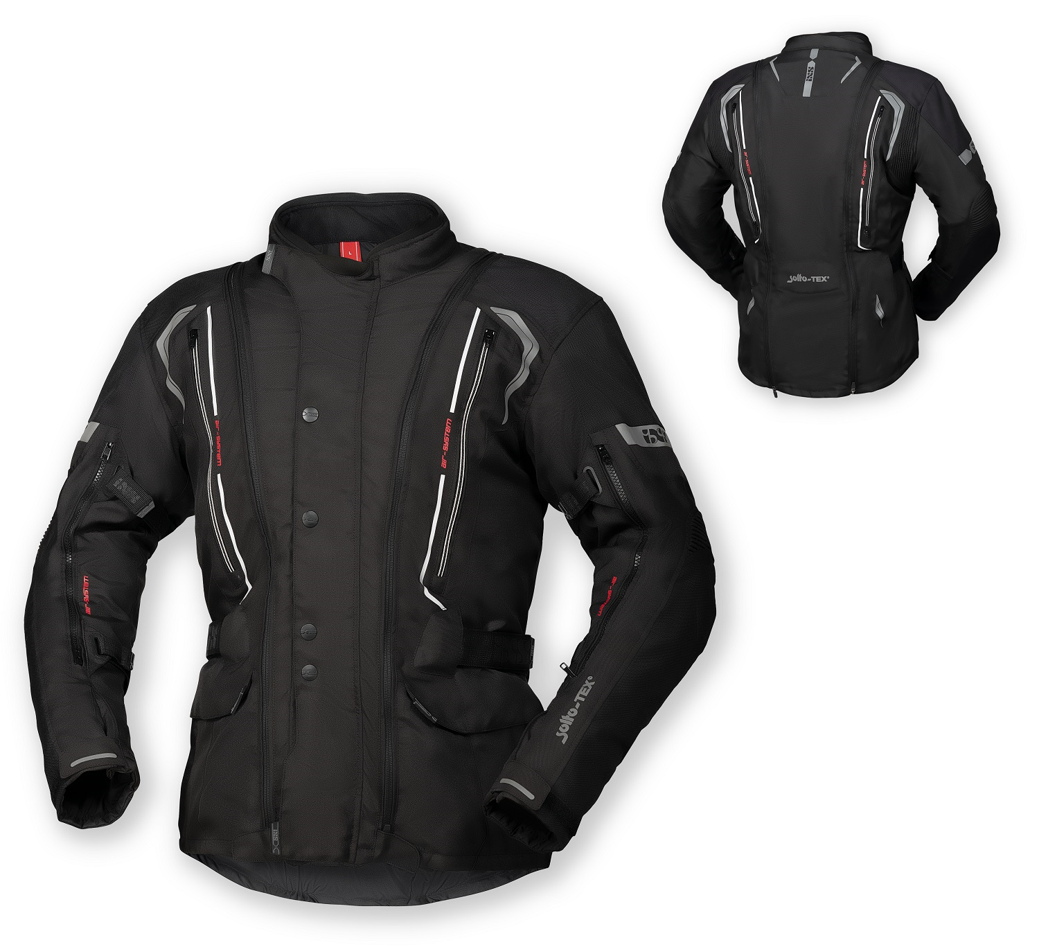 I protettori di alta qualità di livello 2 disposti su spalle e gomiti, così come il protettore dorsale di livello 2, sono conformi ai più recenti standard di sicurezza CE e fanno parte dell’equipaggiamento standard. Le stampe a trasferimento retroriflettenti aumentano la sicurezza e sono al contempo degli eleganti elementi stilistici. Nelle quattro tasche esterne e nelle altre tasche interne c’è abbastanza spazio per riporre i propri oggetti. Le taglie variano da XS bis 5XL.