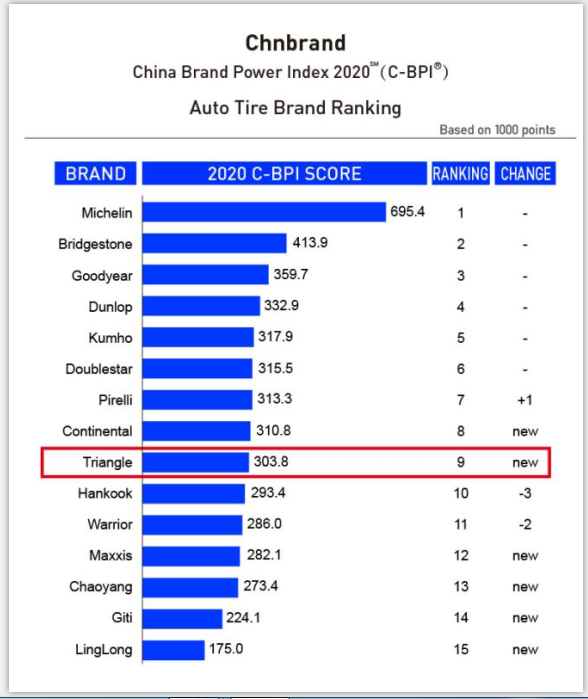 Da quando sono iniziate le pubblicazioni annuali dell’indice C-BPI nel 2011, il brand Triangle è stato incluso molte volte, ma nel sondaggio di quest’anno, è stato addirittura classificato al nono posto nella top 10 list dei marchi di pneumatici. Questo importante riconoscimento riflette la popolarità del brand e la fiducia ormai consolidata che gli accordano i consumatori finali.