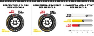 L’opzione strategica più veloce, e anche quella scelta dalla maggior parte dei piloti lo scorso anno a Suzuka, è stata ad una sola sosta. Quindici vetture nelle prime file sono partite montando la mescola Medium, mentre nelle retrovie un paio di piloti hanno scelto la Soft e un altro paio la Hard. Nel secondo stint è stata proprio quest’ultima mescola a diventare protagonista. Le temperature basse hanno consentito stint molto lunghi senza perdita significativa di prestazione cronometrica con le due mescole più dure. I tre piloti saliti sul podio hanno infatti sostituito la Medium attorno al ventesimo giro con la Hard, con cui hanno poi concluso la gara fino alla bandiera a scacchi.