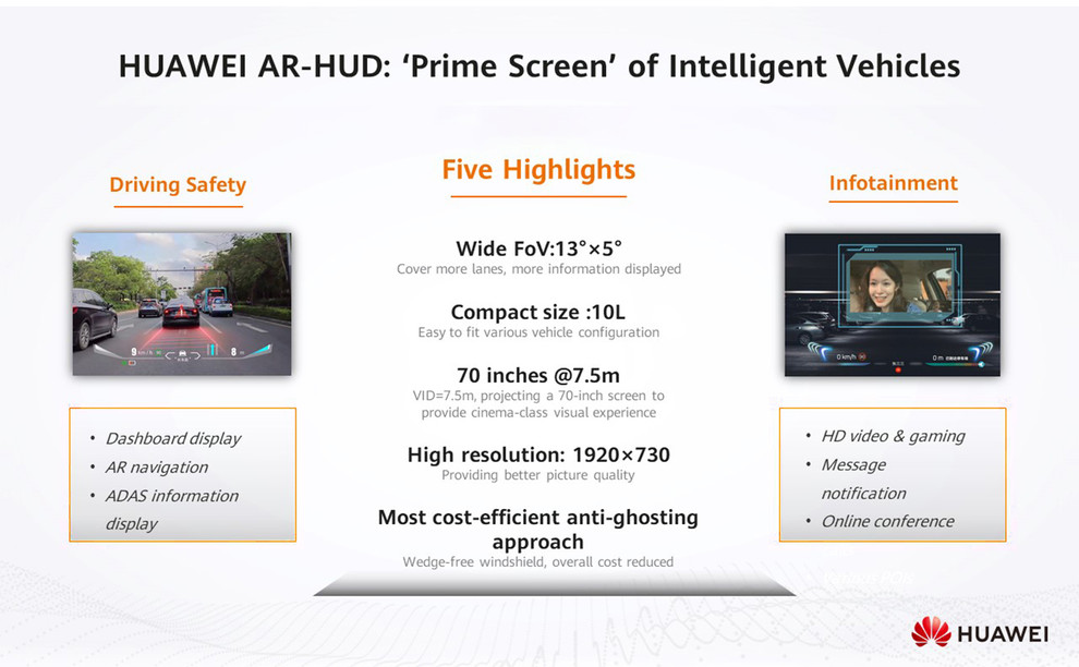 Il sistema ‘AR-HUD’ di Huawei offre un angolo di visuale che può raggiungere i 13°x5°, coprendo così più corsie contemporaneamente. Pertanto, durante la guida, ‘AR-HUD’ trasforma un normale parabrezza in uno schermo HD da 70 pollici per visualizzare tutte le informazioni di guida necessarie. In questo modo i conducenti possono tenersi informati, ad esempio apprendendo informazioni chiave sugli strumenti o sulla navigazione entro una distanza di 7,5 metri, il tutto senza mai distogliere lo sguardo dalla strada.