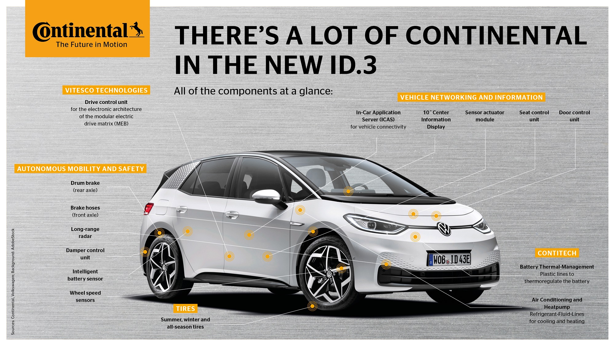 Continental guida la transizione verso la mobilità elettrica e fornisce componenti essenziali per il nuovo modello elettrico Volkswagen ID.3: dai pneumatici EcoContact 6 e TS 850 P a molto, molto altro.