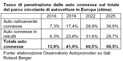 Entro il 2025 circa il 70% del parco circolante di auto sulle strade europee sarà connesso, cioè costituito da vetture dotate di strumenti telematici che, grazie alle connessioni internet e ai dispositivi mobili, sono in grado di connettere l’auto con il mondo esterno (con le infrastrutture stradali, con altri veicoli, con altri dispositivi). Si tratta di una quota cinque volte più elevata di quella stimata a fine 2016 (13,9%) e in netta crescita anche rispetto alla quota stimata per il 2019 (41%). Queste previsioni, che derivano da un’elaborazione dell’Osservatorio Autopromotec sulla base di informazioni Roland Berger, mettono in risalto come le auto connesse siano destinate a giocare un ruolo sempre più di spicco nel futuro dell’automotive.