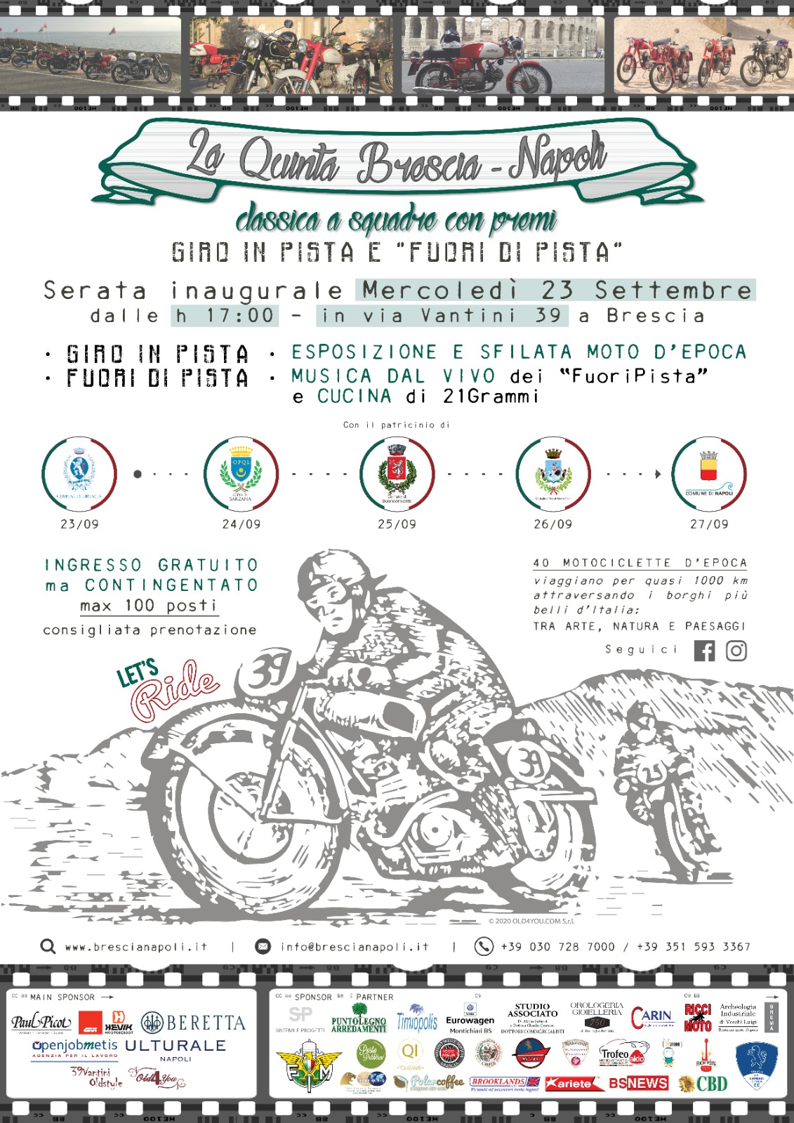 Mercoledì 23 dalle ore 17:00 è prevista la presentazione in via Rodolfo Vantini, 39 con prenotazione consigliata nel rispetto delle normative attuali e del distanziamento. Una serata di festa con esposizione dei mezzi in gara, sfilata dei concorrenti e passerella con pubblico motociclistico al seguito per le vie di Brescia. Giovedì 24 accensione dei motori e sfide al via, per arrivare Domenica 27 a Napoli e premiare le squadre che avranno accumulato più punti.