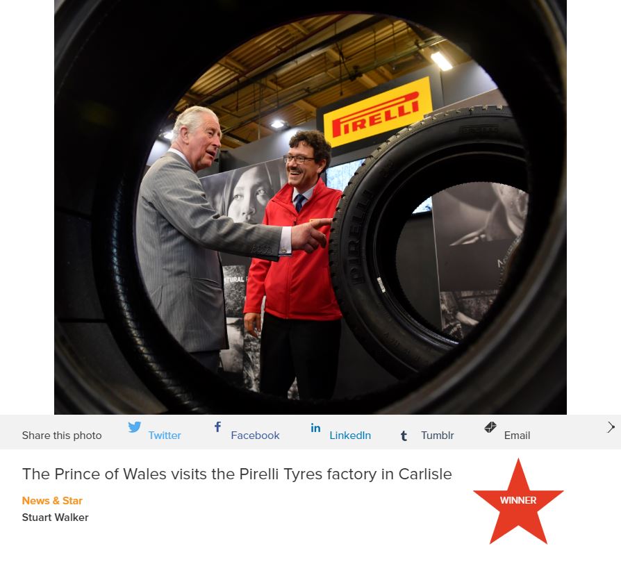 Una foto del principe Carlo in visita allo stabilimento Pirelli di Carlisle è stata nominata ‘foto dell’anno’ nella sezione dedicata alle testate regionali/locali della Royal Rota Photography Competition 2019.
