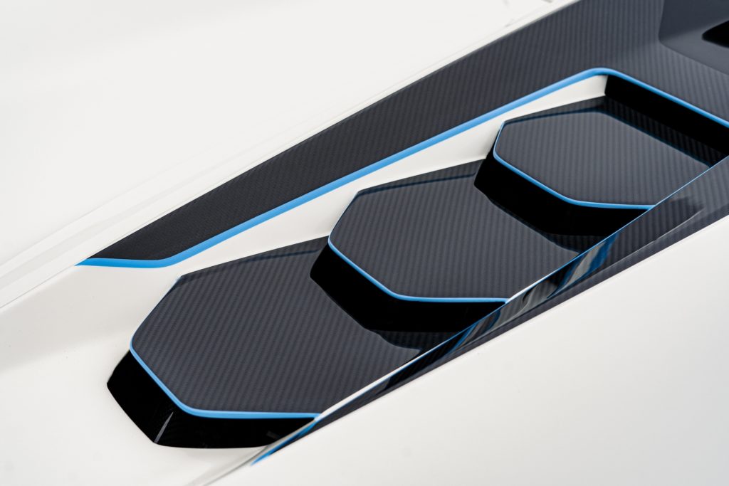 La SC20 è caratterizzata da dettagli esclusivi a partire dai colori carrozzeria su base Bianco Fu, creato per il cliente, su cui spicca la livrea Blu Cepheus. Tonalità ripresa anche negli interni in alternanza al Nero Cosmus e al Bianco Leda. Protagonista assoluto dell’abitacolo è il carbonio a vista, utilizzato per cupolino, parafiamma, pannelli porta, tunnel centrale e dettagli del volante oltre che per la monoscocca. Sempre in carbonio i gusci dei sedili rivestiti in Alcantara e pelle; per i maniglioni delle portiere si è invece optato per l’alluminio ricavato dal pieno. Infine le bocchette dell’aerazione, stampate con tecnologia 3D printing nello stabilimento di Sant’Agata Bolognese.