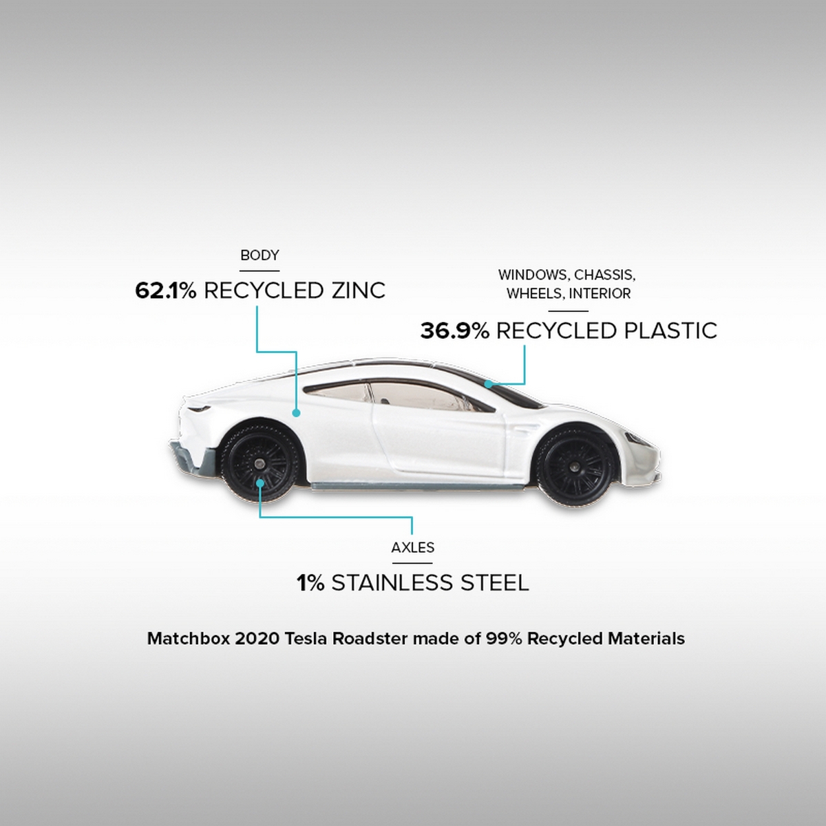 Per illustrare questi principi, il brand presenta Matchbox Tesla Roadster, il suo primo die-cast realizzato con il 99% di materiali riciclati e con certificazione Carbon Neutral. Realizzato per il 62,1% in zinco riciclato, per l’1% in acciaio inox e per il 36,9% in plastica riciclata, Matchbox Tesla Roadster sarà disponibile dal 2022.