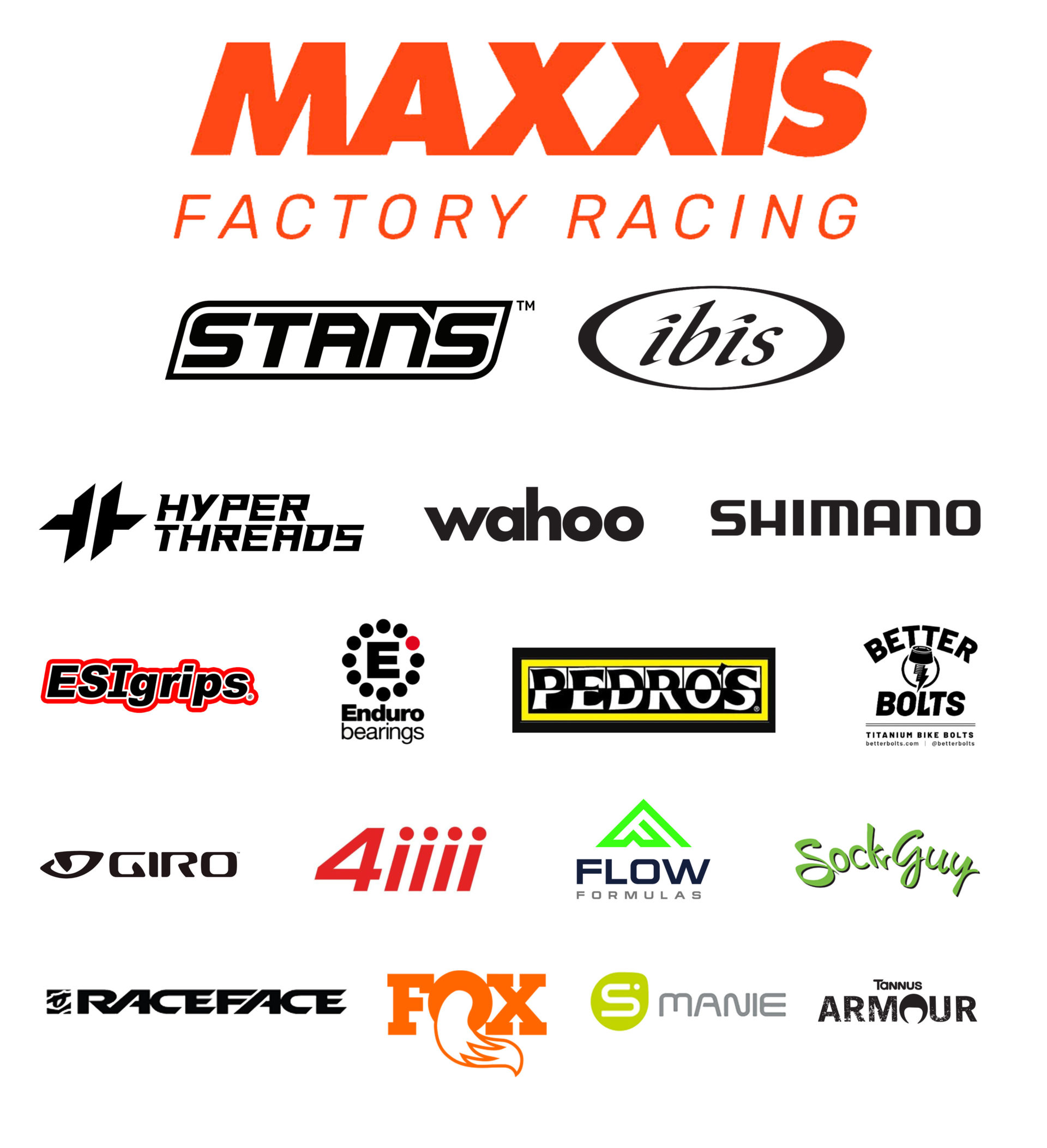 Gli sponsor del Maxxis Factory Racing: Maxxis Tires, Ibis Cycles, Stan’s NoTubes, Enduro Bearings, ESI Grips, Smanie, Sock Guy, Shimano, Wahoo, Fox Racing, RaceFace, Giro, 4iiii, HyperThreads, Flow Formulas, Better Bolts, Tannus Armor and Pedro’s.