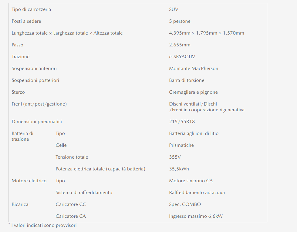 Molti dei media che hanno guidato il prototipo della nostra vettura elettrica hanno affermato che è una delle poche auto elettriche, tra quelle da loro testate, che ha le caratteristiche positive di un’auto normale. Offrire piacere di guida è centrale in ogni Mazda che progettiamo e non sarà diverso per la nostra auto elettrica”.