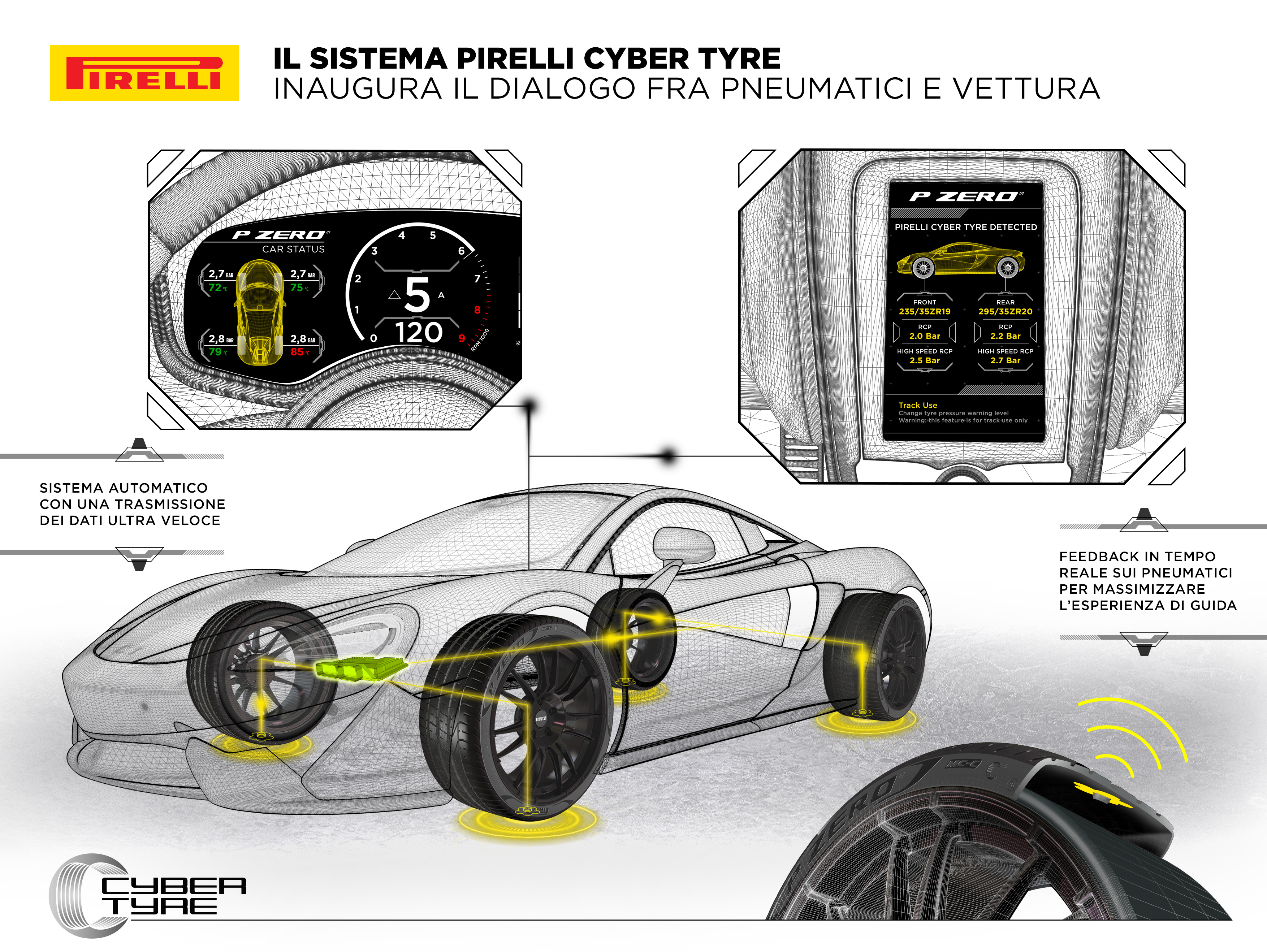 Informazioni, tra cui temperatura e pressione, fondamentali per la sicurezza, monitorate costantemente e trasmesse in tempo reale. Queste, inoltre, vengono rilevate con una maggiore precisione rispetto ai rilevatori tradizionali su valvola, essendo i sensori Pirelli posti a contatto diretto con il pneumatico e non con il cerchio. Il flusso dati originato dai sensori viene elaborato da un software realizzato da Pirelli e integrato nell’elettronica dell’auto. Alcune informazioni vengono visualizzate sul cruscotto e sul display centrale, altre sono utilizzate dai sistemi elettronici del veicolo per calibrare i messaggi di allerta in base alle caratteristiche specifiche della gomma e anche al suo stato.