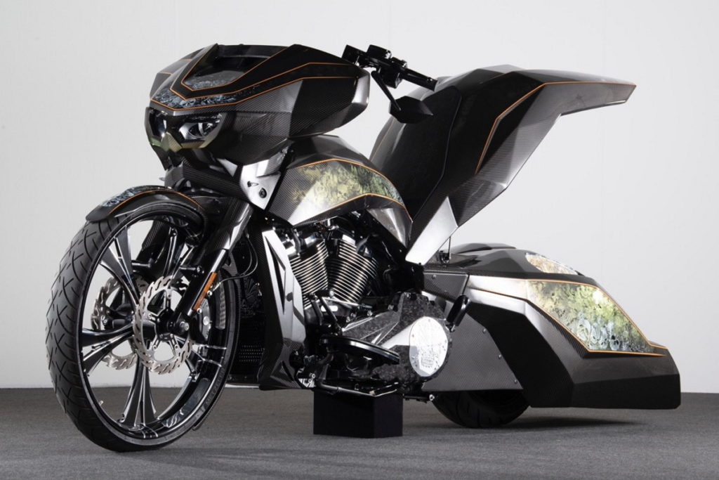 La carrozzeria è interamente realizzata in carbonio CFRP (Carbon Fiber Reinforced Polymer) lavorato in autoclave. La parte posteriore si solleva e dà accesso ai due vani laterali che sostituiscono le borse originali, mentre il serbatoio è un pezzo unico in monoscocca. Il processo di lavorazione della carrozzeria, unitamente ad altri dettagli esclusivi, come la sospensione posteriore pneumatica ad aria, rendono esclusivo anche il prezzo della Flagship, che è già stata venduta a 174.000 euro.