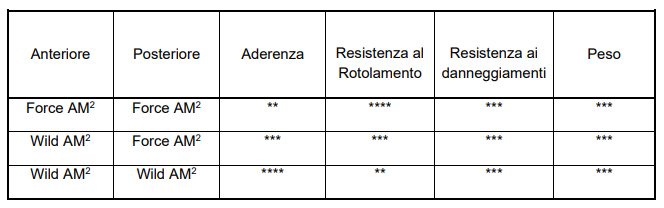 I due pneumatici possono essere abbinati e montati nelle differenti posizioni anteriore o posteriore, come mostrato dalla tabella sottostante, per adattarsi a diverse e specifiche condizioni, alle preferenze del pilota e agli stili di guida.