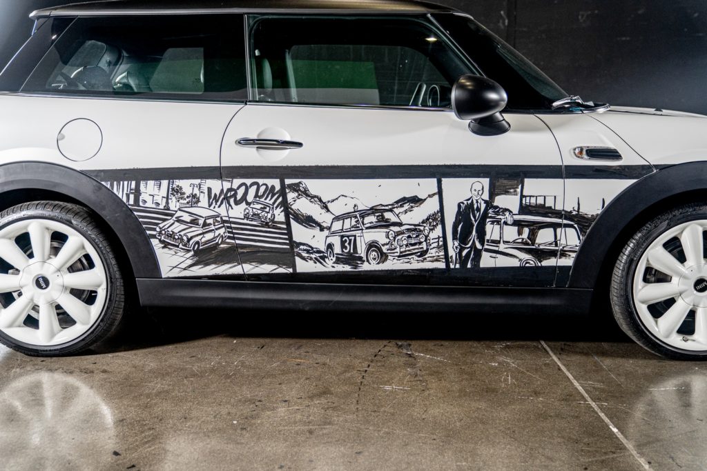 La performance ha dato vita a un’opera assolutamente unica. Le strisce a fumetti che avvolgono l’auto ripercorrono i più iconici momenti della storia di MINI. La storia inizia sulla fiancata destra, con il ritratto di Alec Issigonis, il padre della piccola britannica, per passare poi agli eroici successi di Mini nel Rally di Monte Carlo e alla citazione degli acrobatici inseguimenti della pellicola “The Italian Job”, una delle innumerevoli apparizioni cinematografiche che hanno visto di queste vetture protagonista.