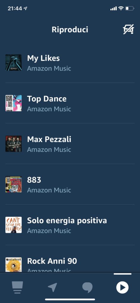 - Play: la schermata Play mostra i media utilizzati più recentemente attraverso i propri dispositivi Alexa e un tasto play/pausa, assieme ad una lista degli ultimi brani riprodotti. Selezionando uno dei brani sullo schermo, la schermata inizierà a mostrare il brano in riproduzione, oltre ad altre informazioni aggiuntive. Si potrà quindi accedere all’intrattenimento semplicemente chiedendo ad Alexa mentre si è alla guida o utilizzando le scorciatoie e i controlli touch-screen della Modalità Auto.