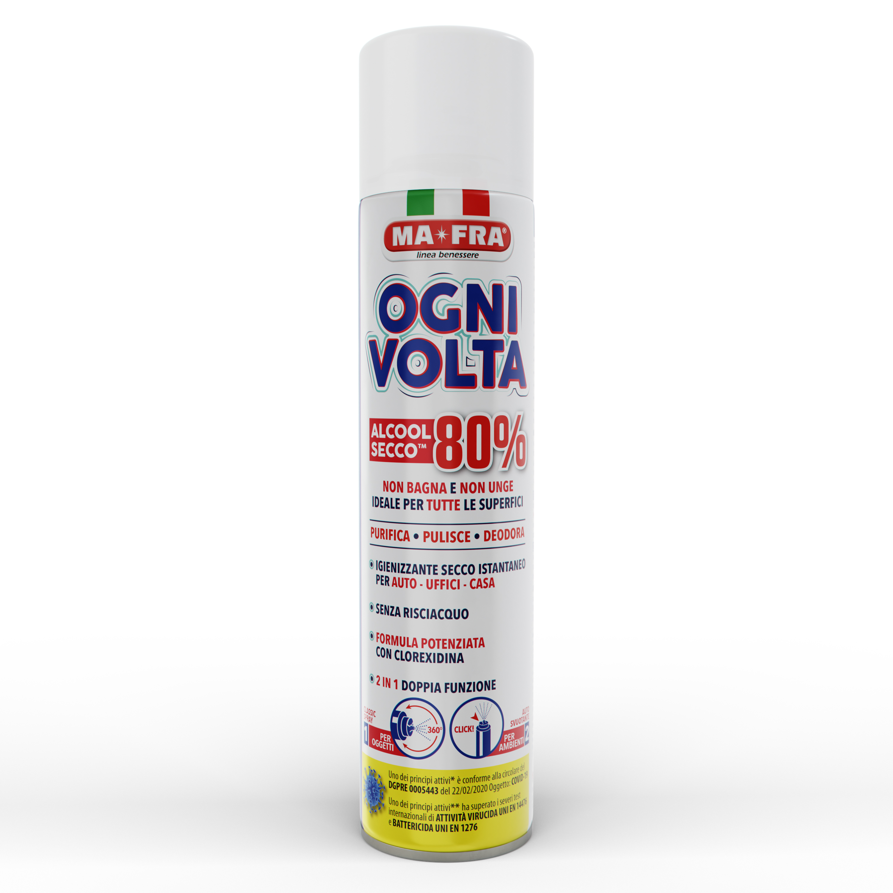 Una bomboletta nuova di igienizzante “Ogni Volta” Ma-Fra è efficace per un locale fino a 40 mq ed è quindi ideale anche in ambienti quali ristoranti, bar, camere d’albergo, cliniche, pullman o scuolabus. “Ogni Volta” contiene Alcool all’80%, che lo rende conforme alla circolare del DGPRE 0005443 del 22/02/2020 – Oggetto COVID-19.
