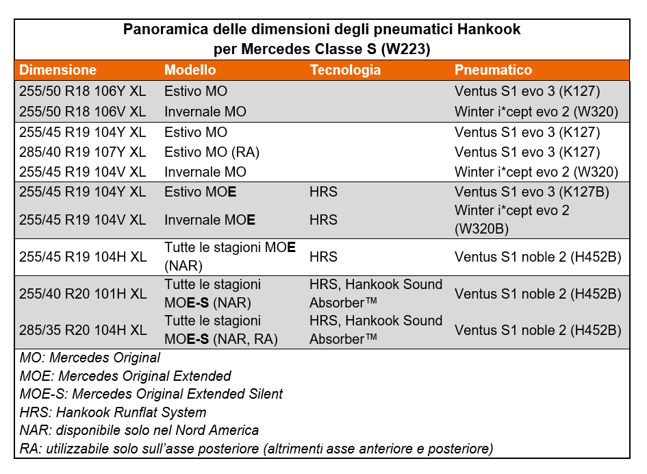 Nel mercato europeo, le dimensioni degli pneumatici estivi Ventus S1 evo 3 di Hankook per Mercedes-Benz Classe S variano da 255/50 R18 a 285/40 R19. Il Mercedes-Benz Group ha approvato il Winter i*cept evo 2 di Hankook nelle dimensioni 255/50 R18 e 255/45 R19 come pneumatici invernali per il suo modello di punta. Gli ingegneri Hankook sono riusciti a migliorare sensibilmente il comportamento di guida di entrambe le tipologie di pneumatici grazie a una cintura di rafforzamento ibrida di fibra aramidica.