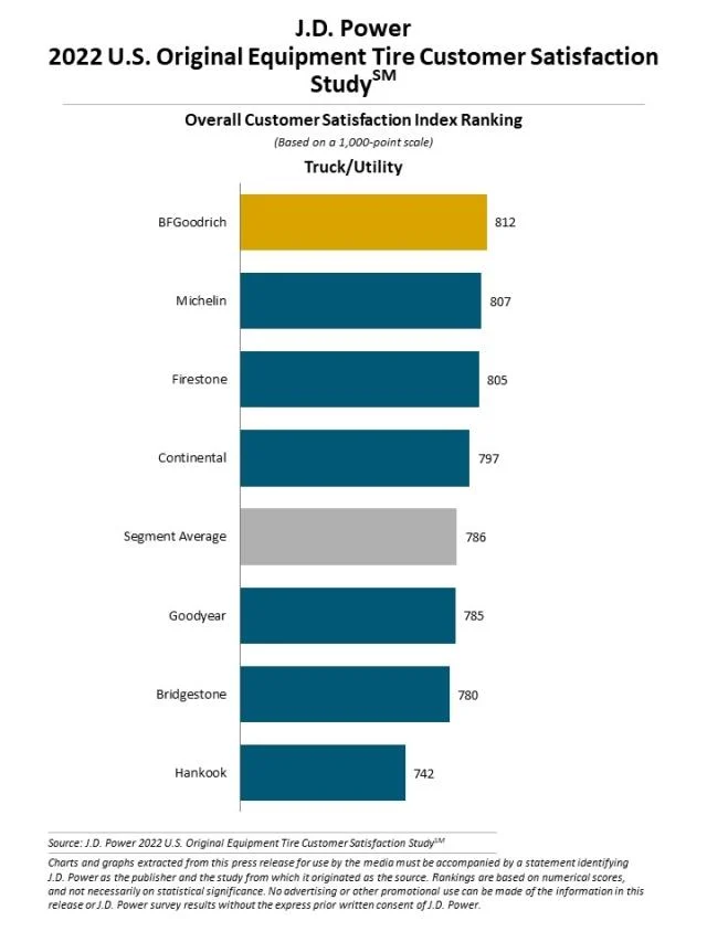 BFGoodrich è al primo posto nel segmento truck/utility con un punteggio di 812. Michelin è al secondo posto (807) e Firestone è al terzo posto (805). La media del segmento è 786.