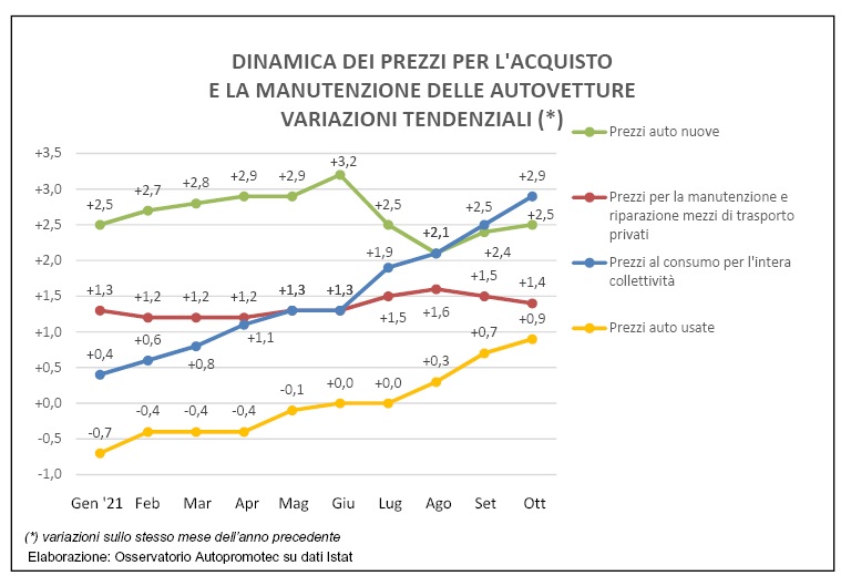 L’elaborazione dell’Osservatorio Autopromotec ha preso in considerazione anche la situazione dei prezzi delle auto usate, i cui prezzi in ottobre hanno registrato un aumento dello 0,9%, con una tendenza in crescita rispetto a luglio (stabile rispetto al 2020), agosto (+0,3%), e settembre (+0,7%). I prezzi per i servizi di manutenzione e riparazione auto in ottobre hanno avuto un tasso di crescita su base annua dell’1,4%, in lieve calo rispetto all’1,5% di settembre e all’1,6% di agosto.