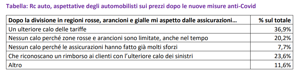 Per il 66,7% degli intervistati l’esecutivo avrebbe dovuto riattivare la misura insieme con il meccanismo che prevede la suddivisione in zone gialle, arancioni e rosse e per la circa la metà di loro il provvedimento sarebbe dovuto valere almeno per le zone rosse. Il 16,6% ritiene invece “inutile o complicato” riproporre la proroga di ulteriori 15 giorni al rinnovo della polizza allo stato attuale, mentre il restante 16,7% non ha un’opinione sulla questione.
