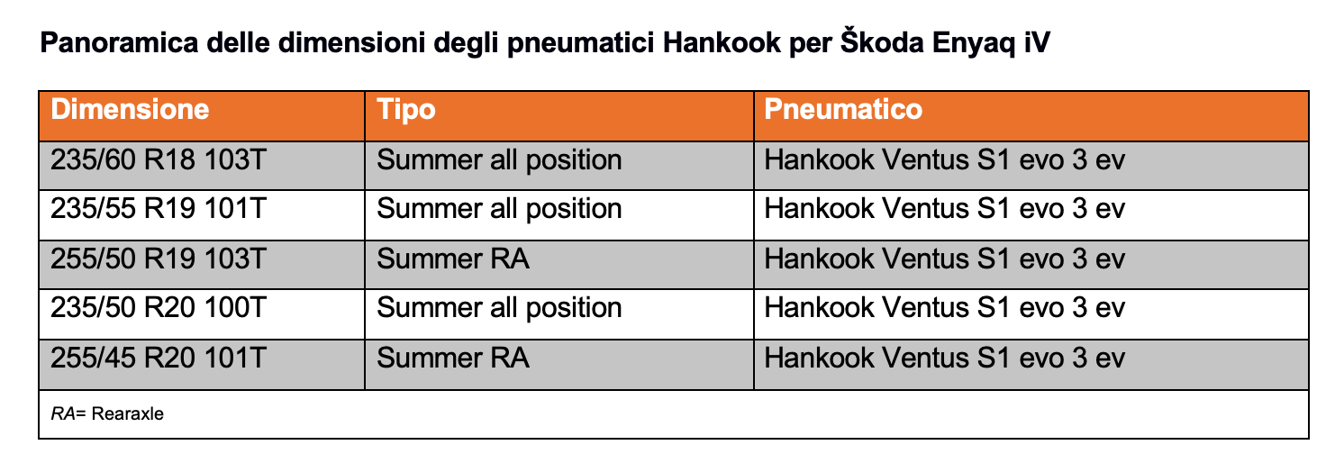 “Hankook e Škoda hanno già lavorato insieme in passato. Ecco perché siamo particolarmente lieti di continuare la nostra partnership di lunga data e di fiducia con il primo SUV del marchio alimentato esclusivamente a batteria“, afferma Sanghoon Lee, presidente di Hankook Tire Europe. “Le gomme Ventus S1 evo 3 ev, perfettamente adattate alle esigenze dei veicoli elettrici, offrono un importante contributo alla mobilità sostenibile in combinazione con il nuovo modello Škoda Enyaq iV ”.