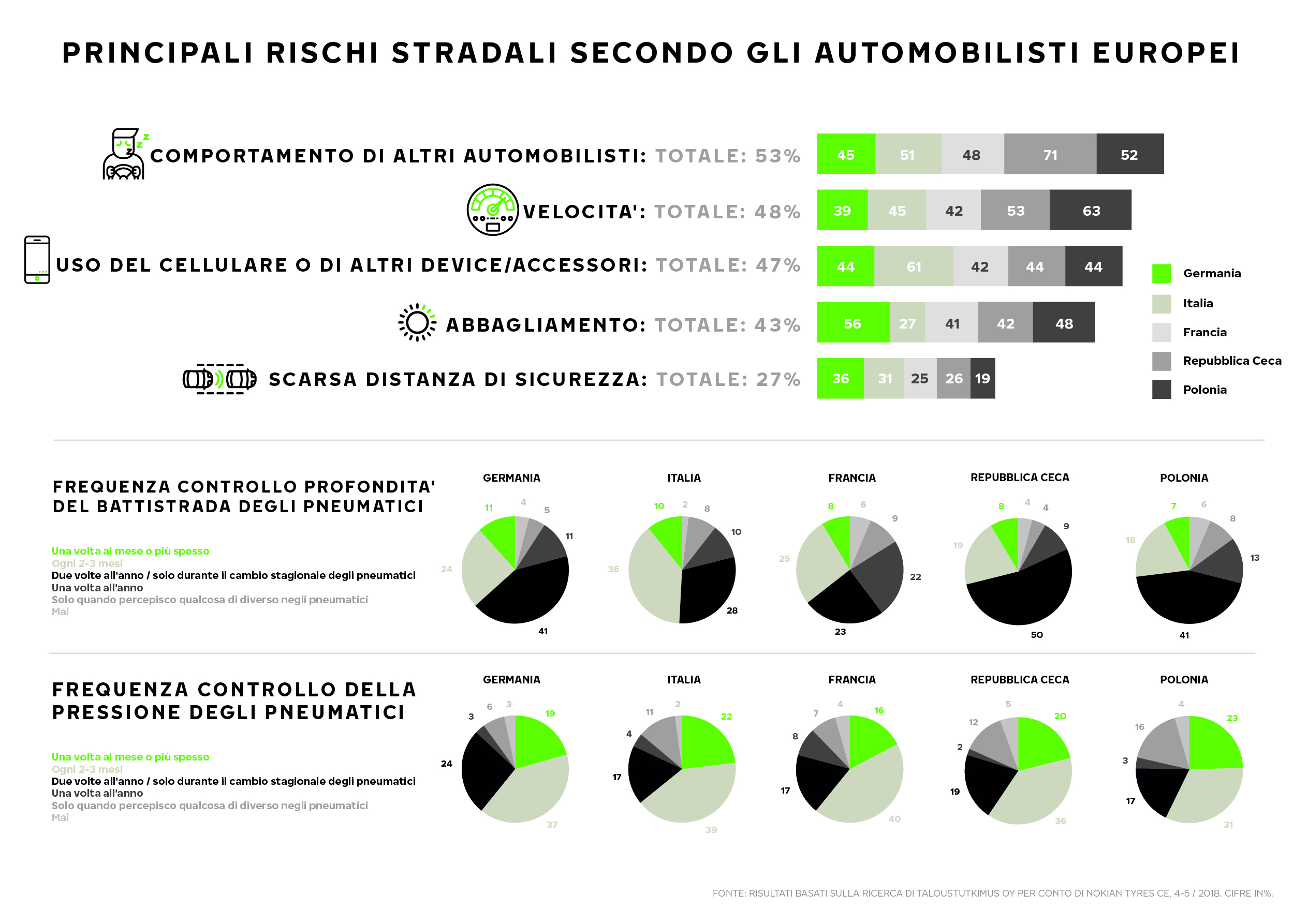 Secondo la survey di Nokian Tyres, la percezione di un rischio più elevato sulle strade nel periodo estivo è causata dal comportamento degli altri automobilisti, dalla velocità eccessiva e dall’uso del telefono alla guida. I cechi, i polacchi e gli italiani sono coloro che hanno meno fiducia negli altri automobilisti.