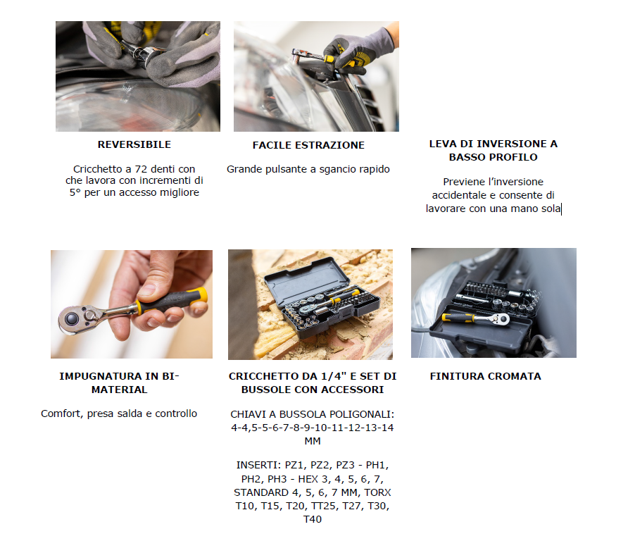 Non può mancare sul banco di lavoro degli hobbisti e di chiunque si occupa della manutenzione fai da te della casa, dell’auto o della motocicletta: è il nuovo set Stanley Compatto 1/4″ con 37 pezzi.