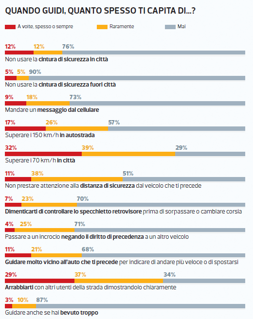 Un’altra nota dolente riguarda l’uso delle cinture di sicurezza. Il 90% degli automobilisti afferma di utilizzarle sempre fuori città, mentre in ambito urbano questa percentuale scende al 76%. Dall’indagine emerge, inoltre, che il 37% degli automobilisti ritengono basso il rischio di essere multati per il mancato utilizzo delle cinture di sicurezza, uno strumento fondamentale perridurre il numero di vittime negli incidenti stradali. Cattive abitudini anche riguardo i limiti di velocità, la maggior parte (71%) degli automobilisti ammette di superare i 70 km/h in città, quando il limite è di 50km/h; in autostrada il 43% guida oltre i 150 km/h. Solo il 38% di coloro che tendono a superare i limiti stabiliti pensa che riducendo la velocità si possa contenere il rischio di sinistri sulle strade, la percentuale sale al 63% tra gli automobilisti che tendenzialmente si attengono alla velocità imposta dal codice stradale. La tendenza a sottovalutare il pericolo è aumentata anche dal convincimento di riuscire, nella maggioranza dei casi, a non essere sanzionati: 1 automobilista su 5 ritiene che il rischio di essere multati per eccesso di velocità sia molto basso. Un’altra aggravante della situazione è data dal mancato rispetto della distanza di sicurezza, che riguarda 1 automobilista su 2. Infine, per la troppa fretta, 1 su 3 ha la pericolosa abitudine di avvicinarsi eccessivamente al veicolo che lo precede per segnalare di farsi da parte.