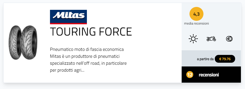 Detto delle prime 5 posizioni “4 stagioni” l’altra sorpresa è che al sesto posto c’è la prima gomma moto in classifica, e non è di un produttore premium affermato, ma di Mitas: è Mitas Touring Force, il pneumatico ceco dedicato al segmento touring.