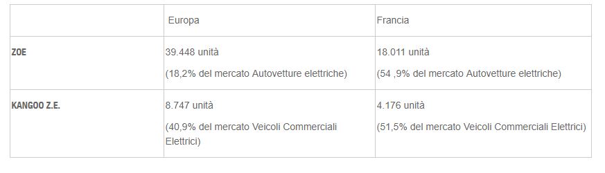 Pioniere con il lancio di una gamma di veicoli elettrici già nel 2011, Renault è leader del mercato elettrico in Europa per il 4° anno consecutivo. Quasi un veicolo elettrico su tre che circola sulle strade europee è Renault. Nel 2018 le vendite di veicoli elettrici Renault in Europa hanno registrato una crescita del 36%, con una forte accelerazione nel secondo semestre, a +62%. In Francia, la marca detiene da sola il 56,8% del mercato dei veicoli elettrici, autovetture e veicoli commerciali.