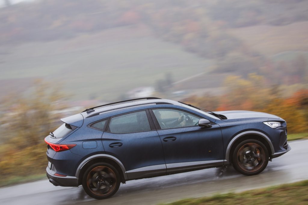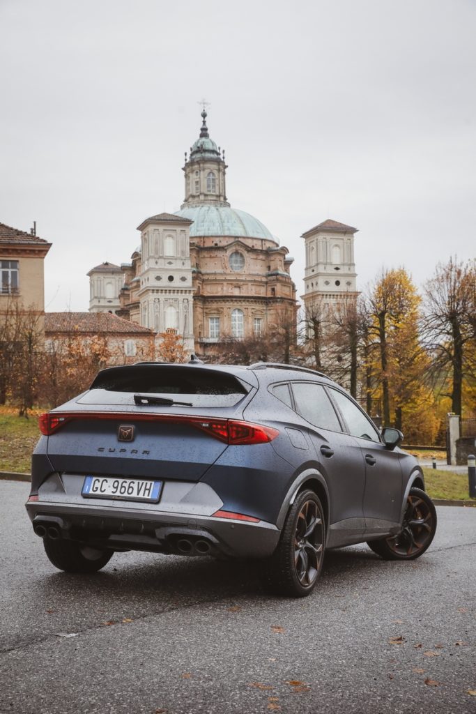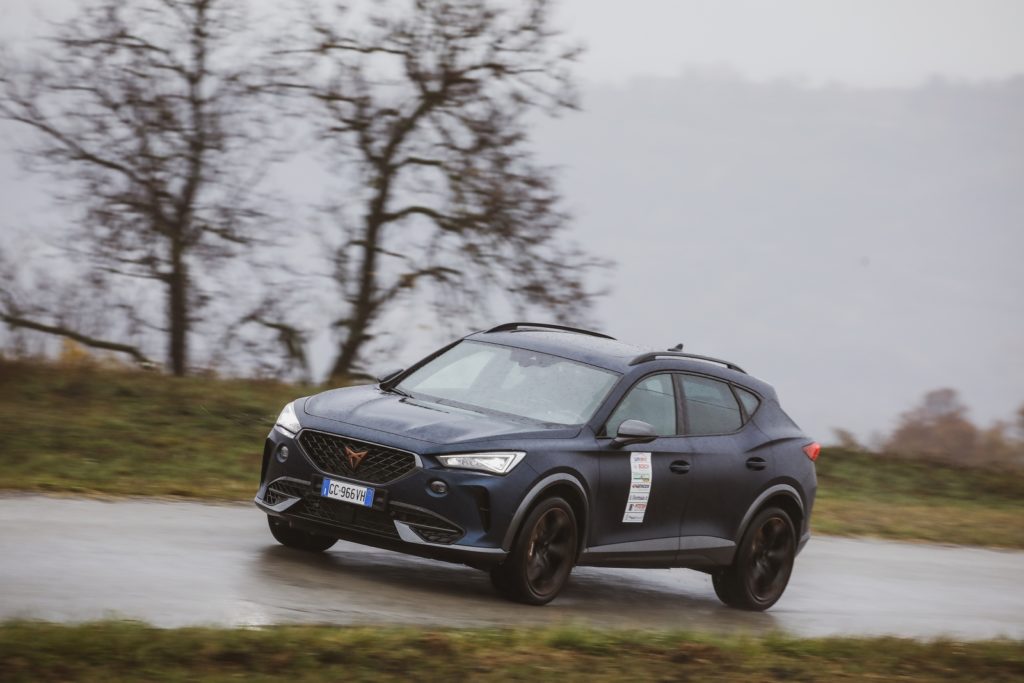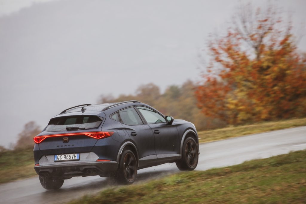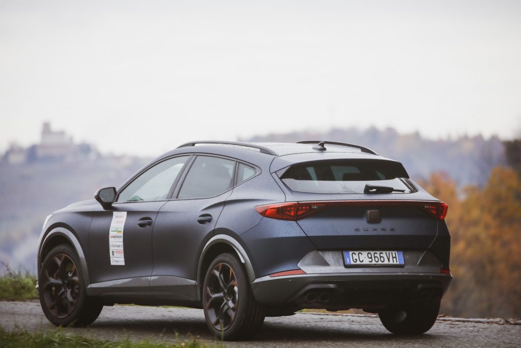 Le linee sinuose delle colline piemontesi, anche se l’asfalto presenta condizioni insidiose, in un’alternanza tra chiazze di umido e condizioni di bagnato, sono un teatro ideale per esaltare le caratteristiche di equilibrio e tenuta della Cupra Formentor Vz, mai in crisi anche quando il ritmo si fa più sostenuto.